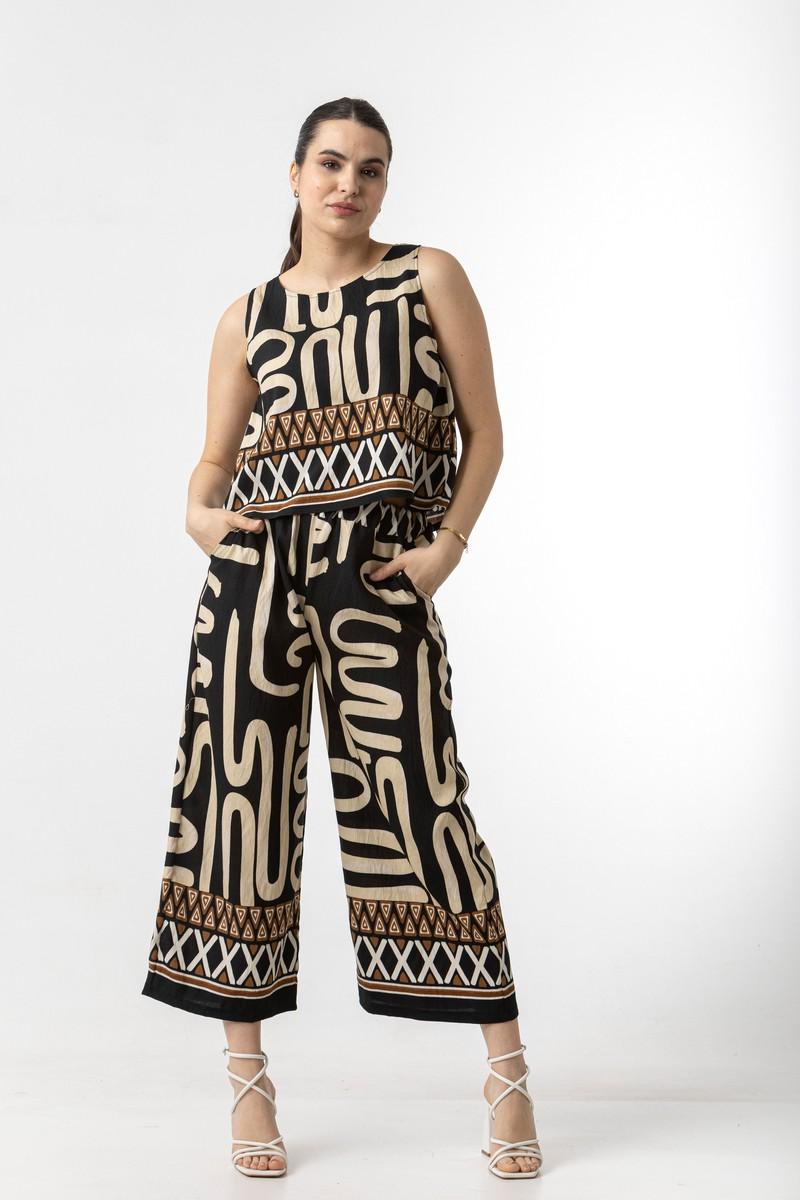 Ζιπ κυλότ one-size σε σταθερό εμπριμέ ύφασμα με μπορντούρα και λάστιχο στη μέση.