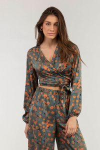 Μπλούζα εμπριμέ σατέν δετή