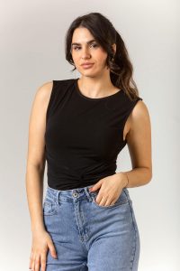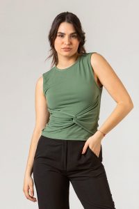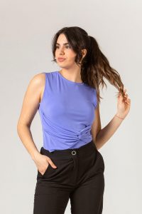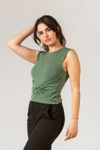 Μπλούζα αμάνικη σε ελαστικό ζέρσεϋ ύφασμα με κόμπο μπροστά.