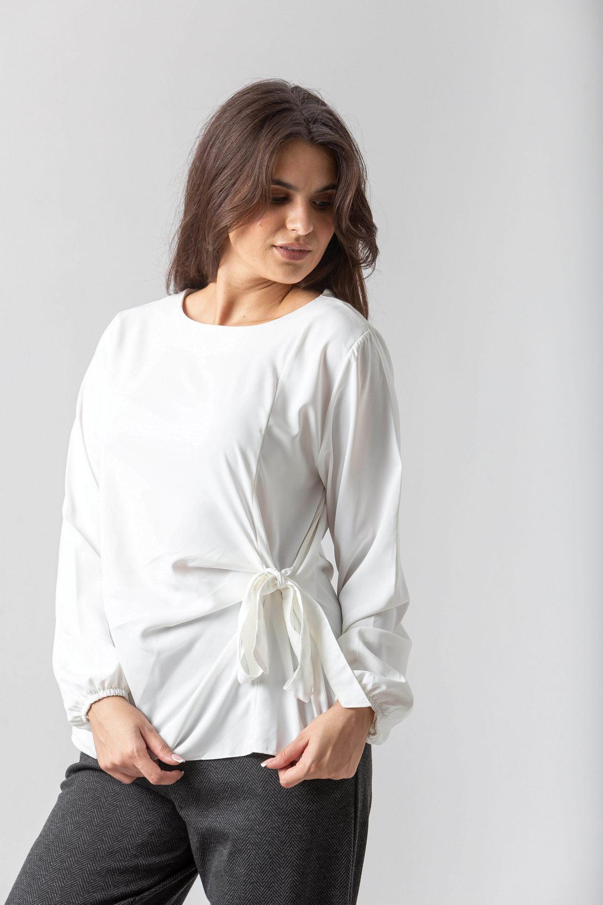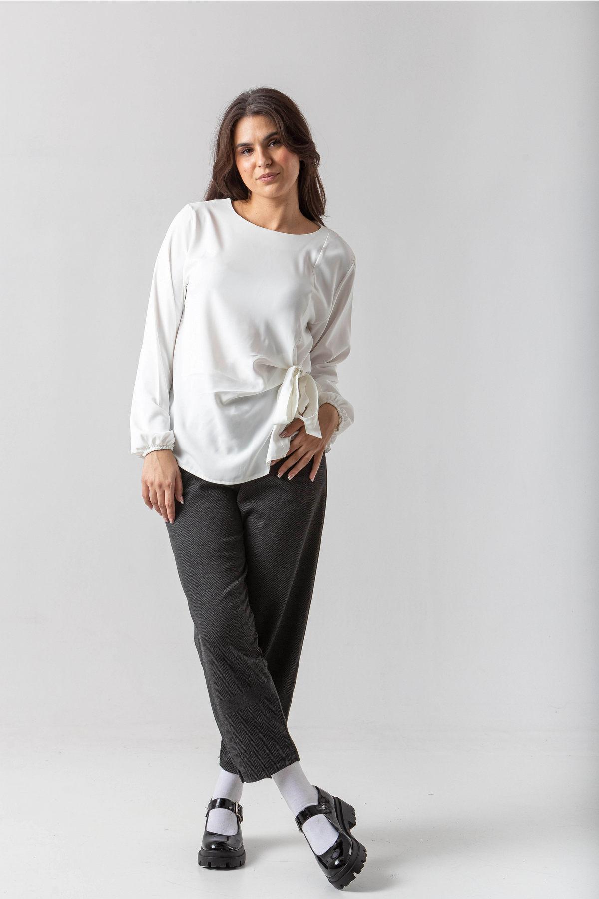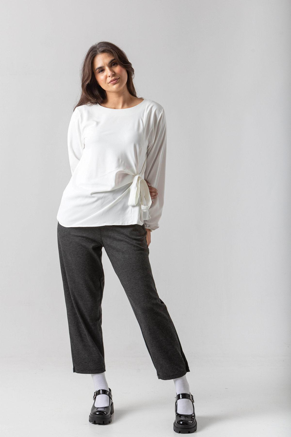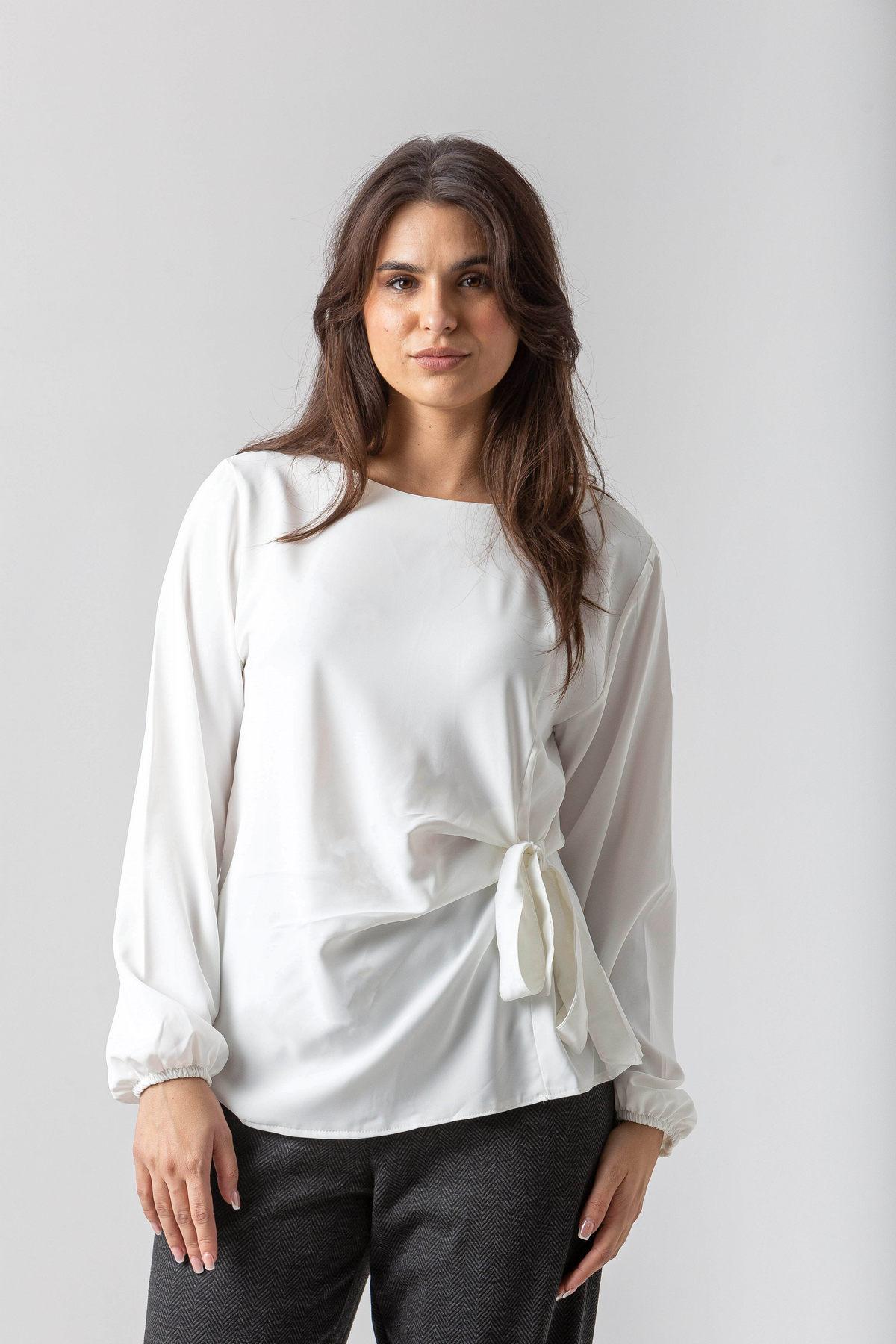 Μπλούζα σε σταθερό ύφασμα με απαλή υφή, πιέτες και δέσιμο στο πλάι.