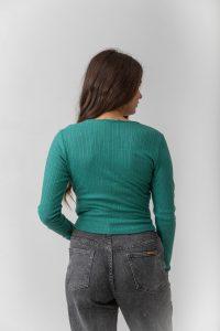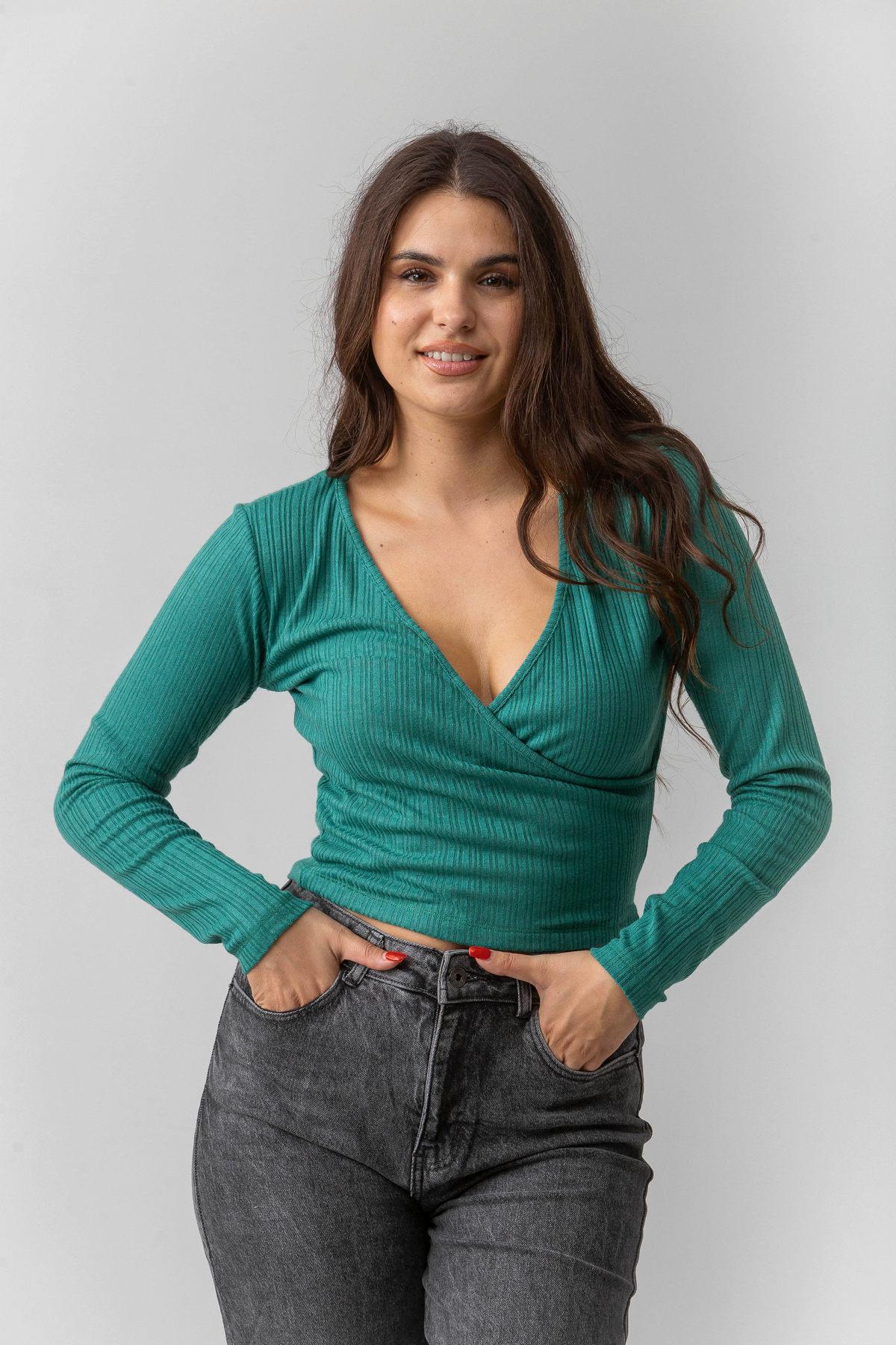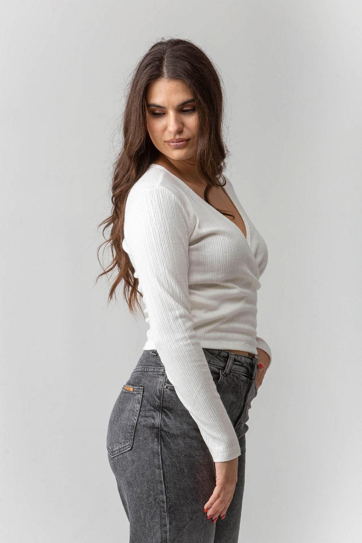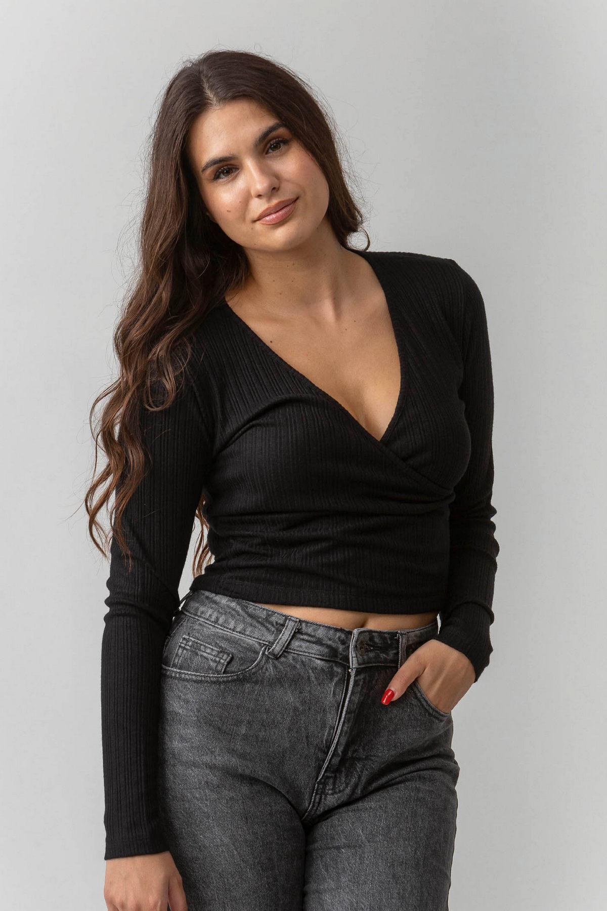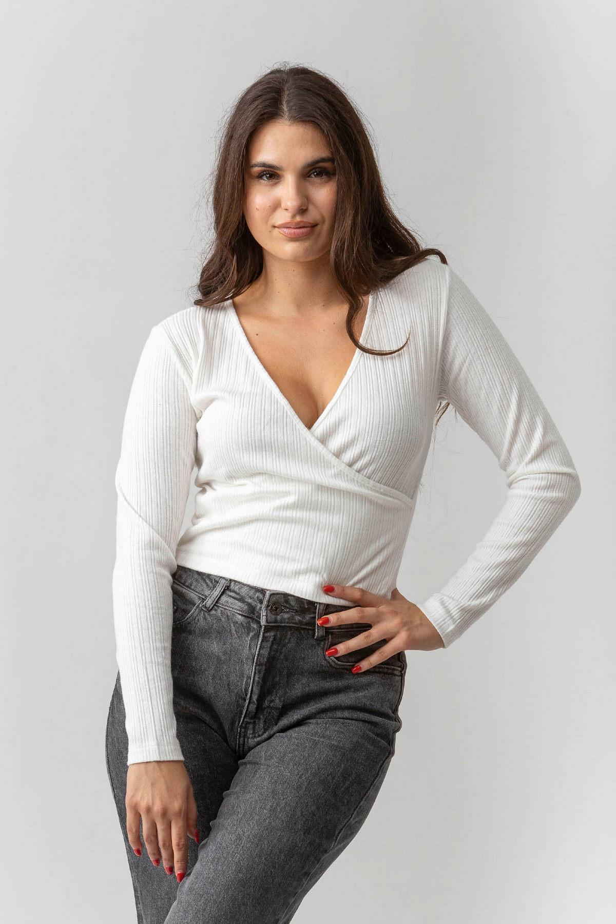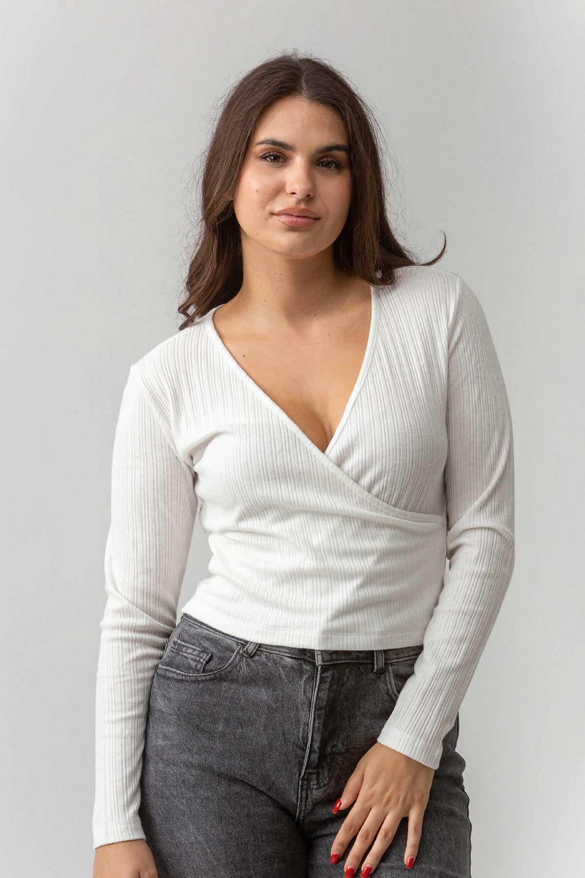 Μπλούζα σε ελαστικό ριπ ύφασμα με κρουαζέ λαιμόκοψη.