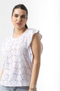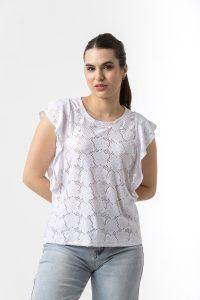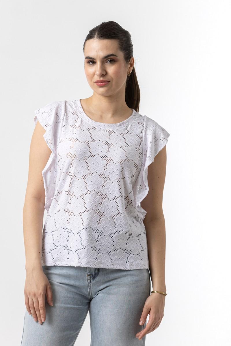 Μπλούζα κοντομάνικη σε ελαστική δανδέλα με βολάν μανίκια.