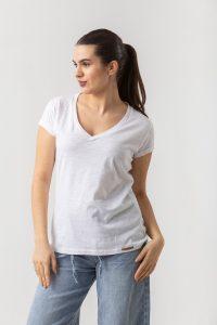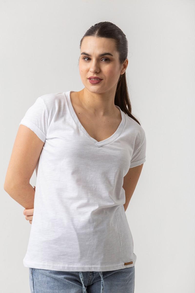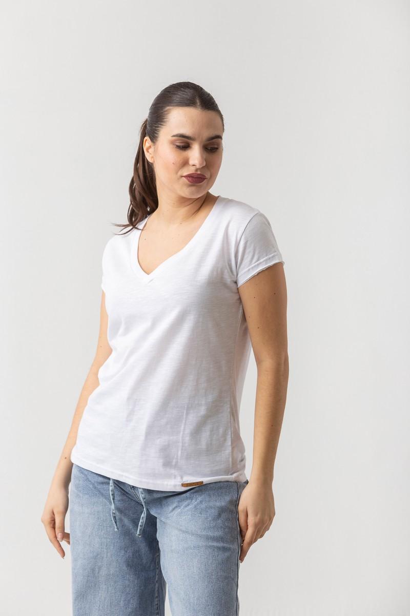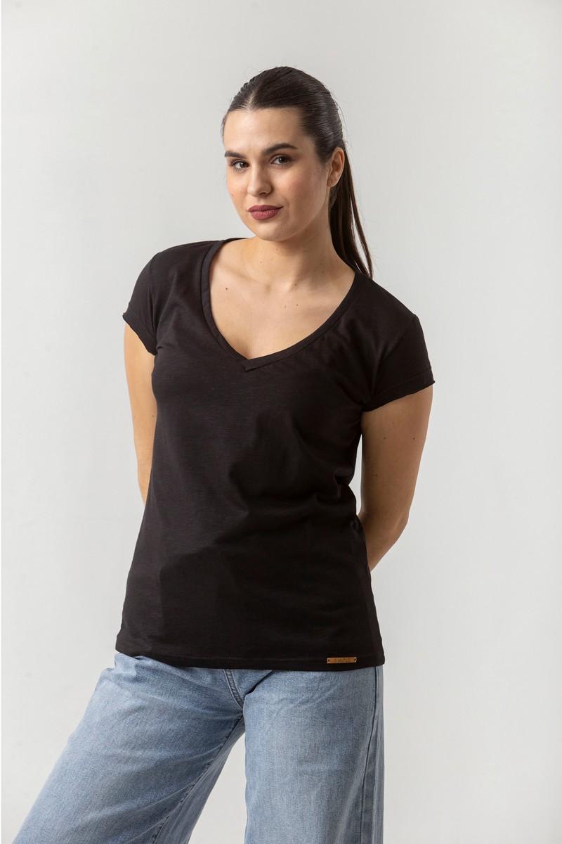 Μπλούζα σε βαμβακερή φλάμα με V-λαιμόκοψη και δερματάκι.
