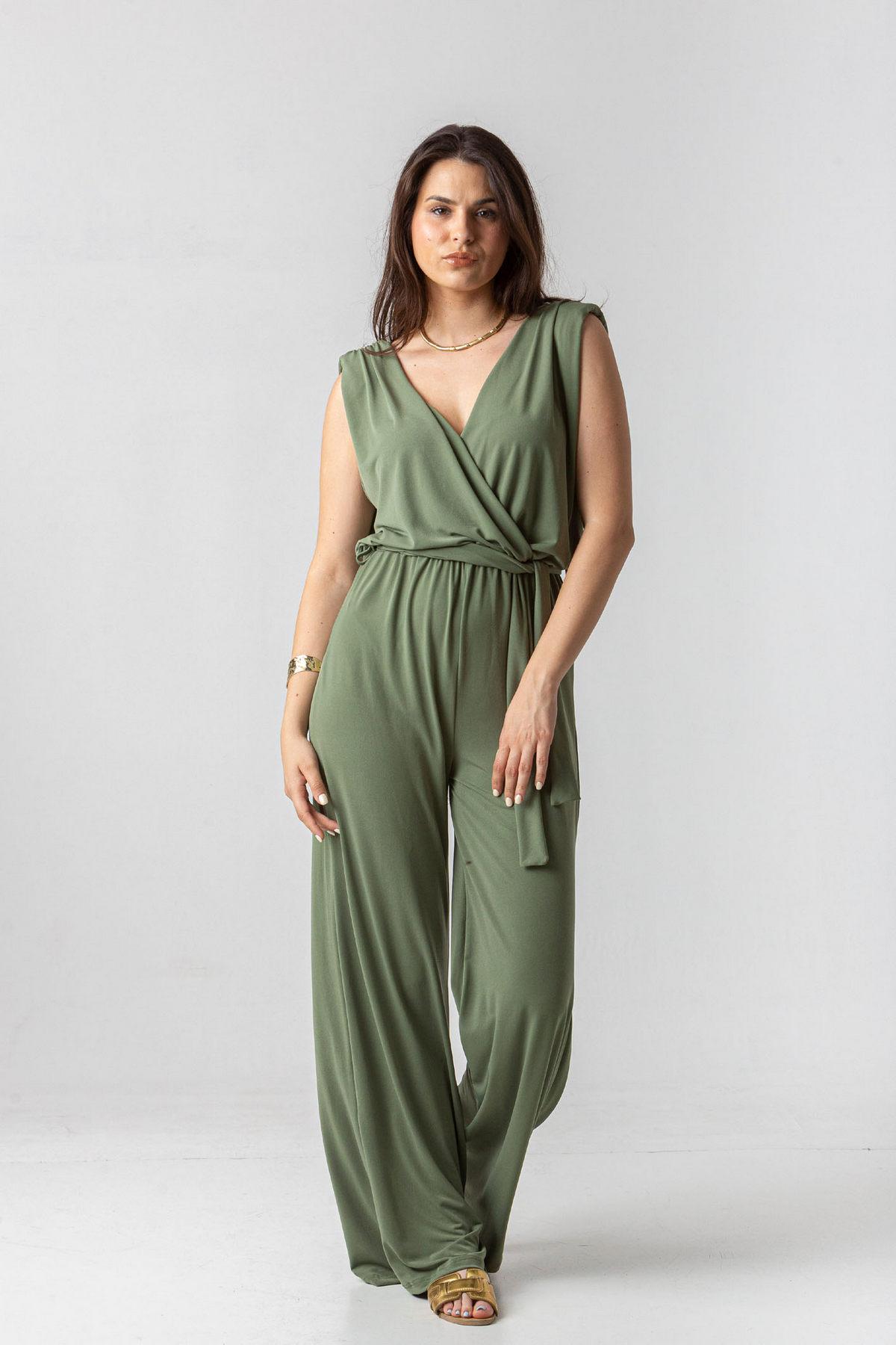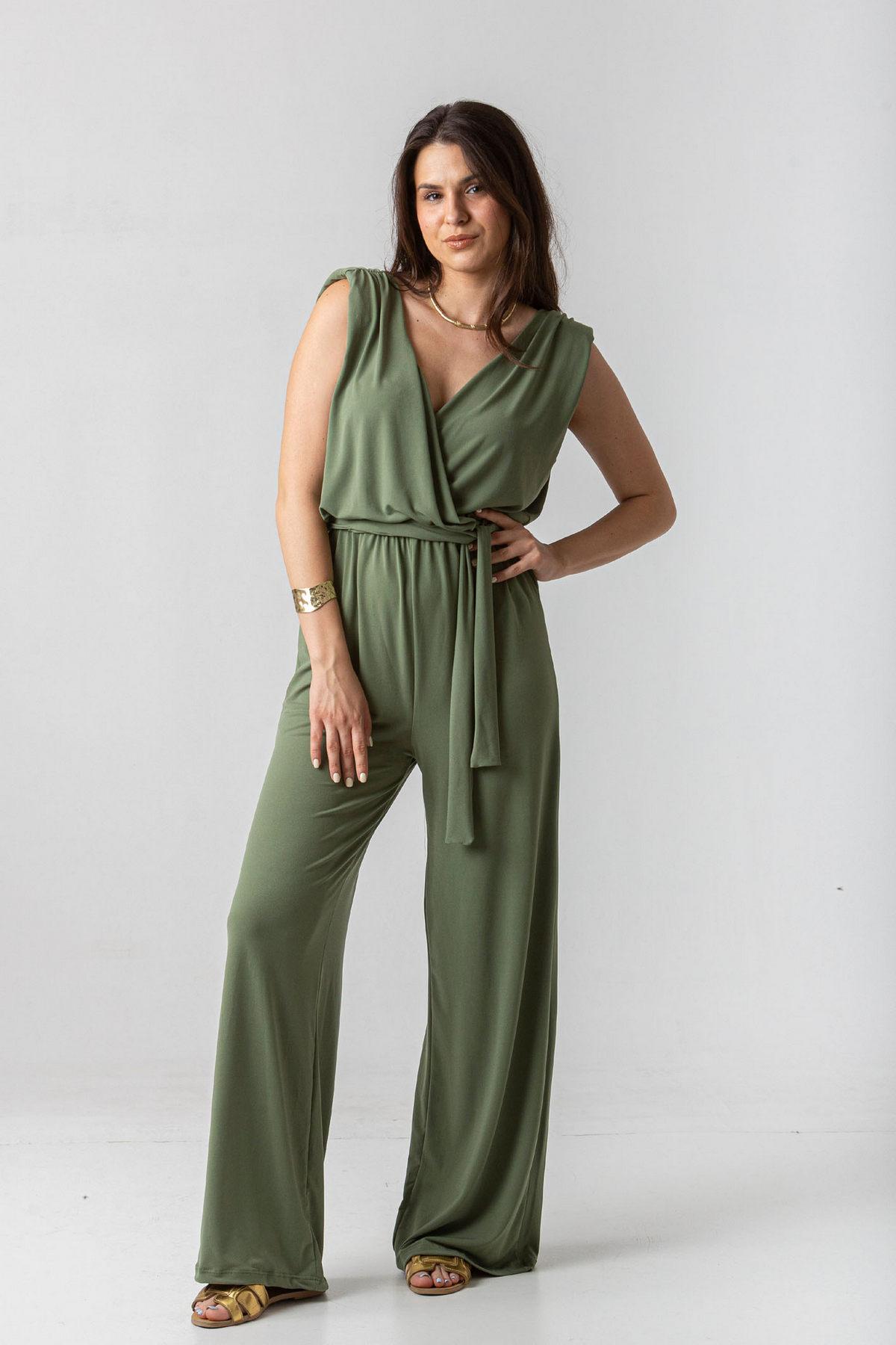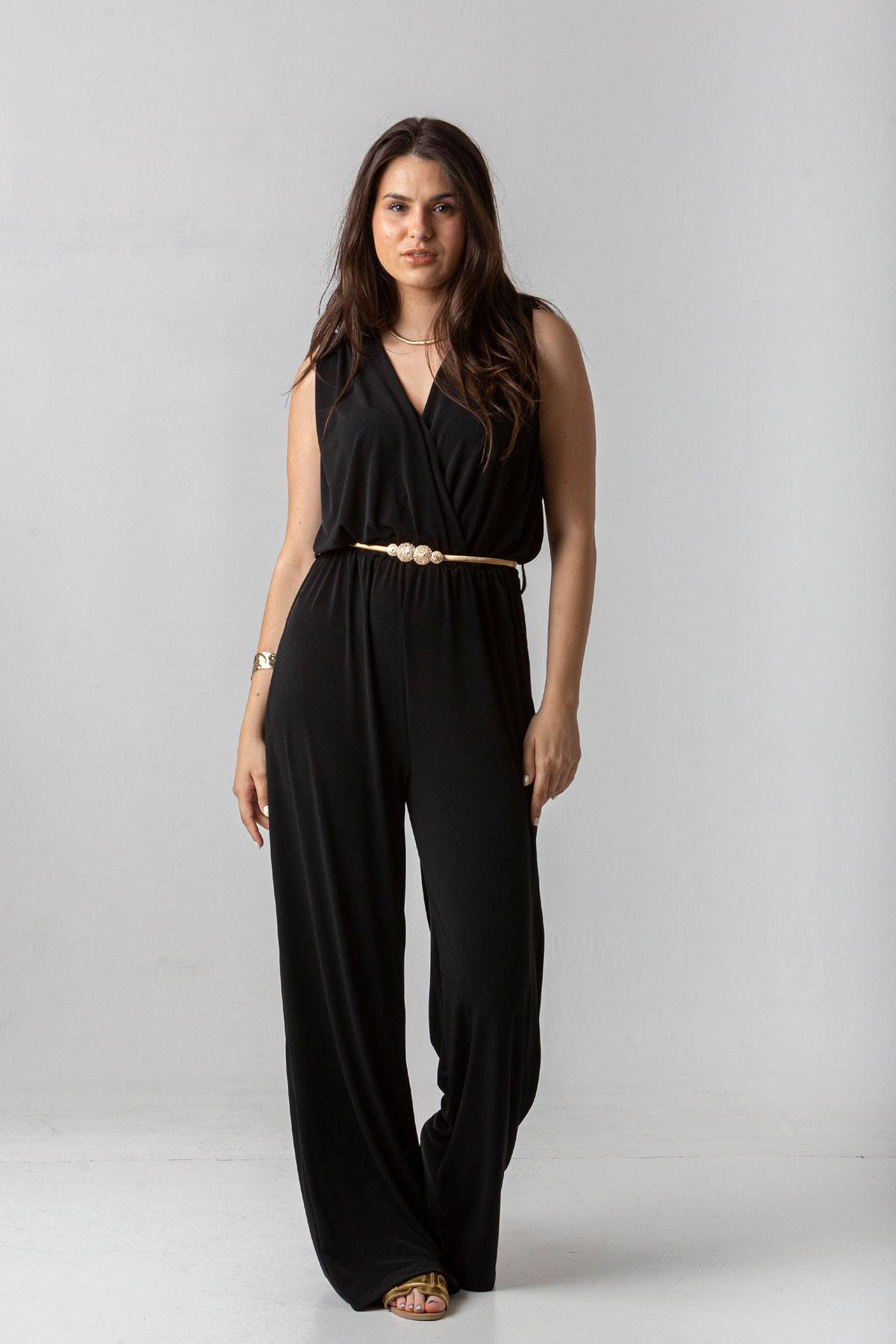 Ολόσωμη φόρμα σε ελαστικό ύφασμα, με λάστιχο στη μέση και ζωνάκι.