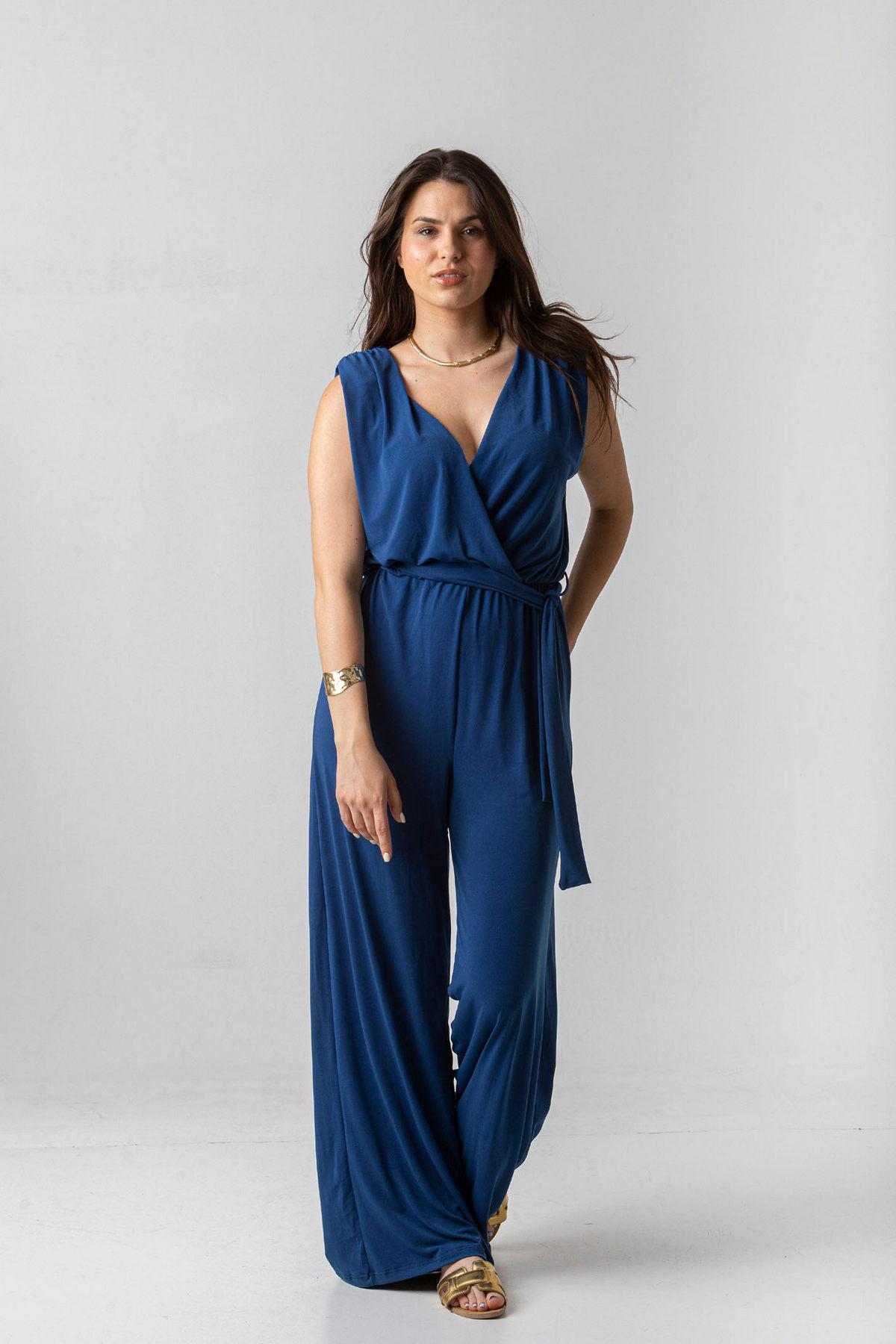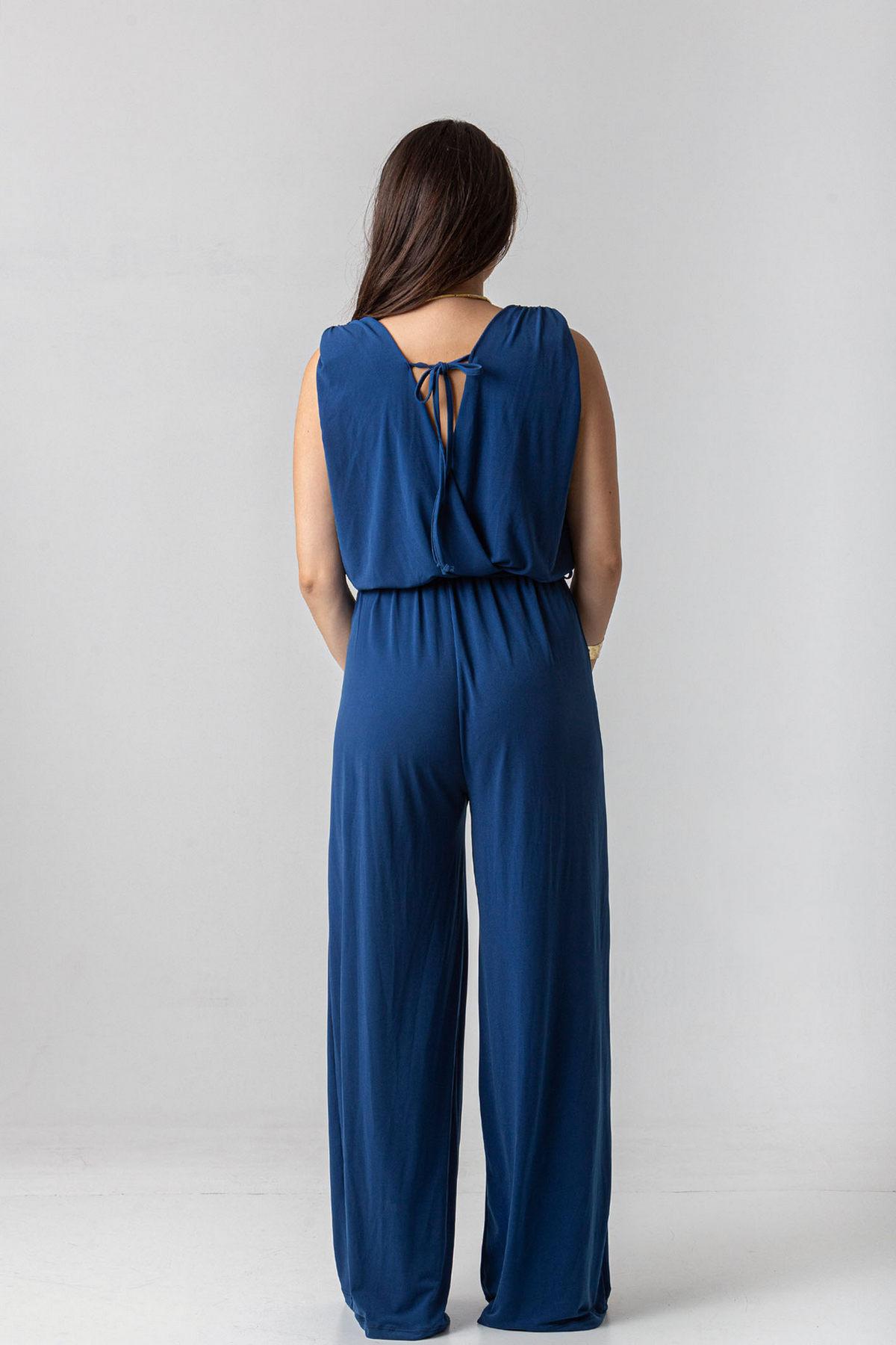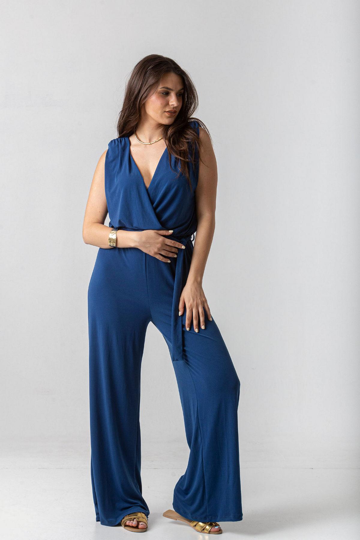 Ολόσωμη φόρμα σε ελαστικό ύφασμα, με λάστιχο στη μέση και ζωνάκι.