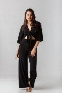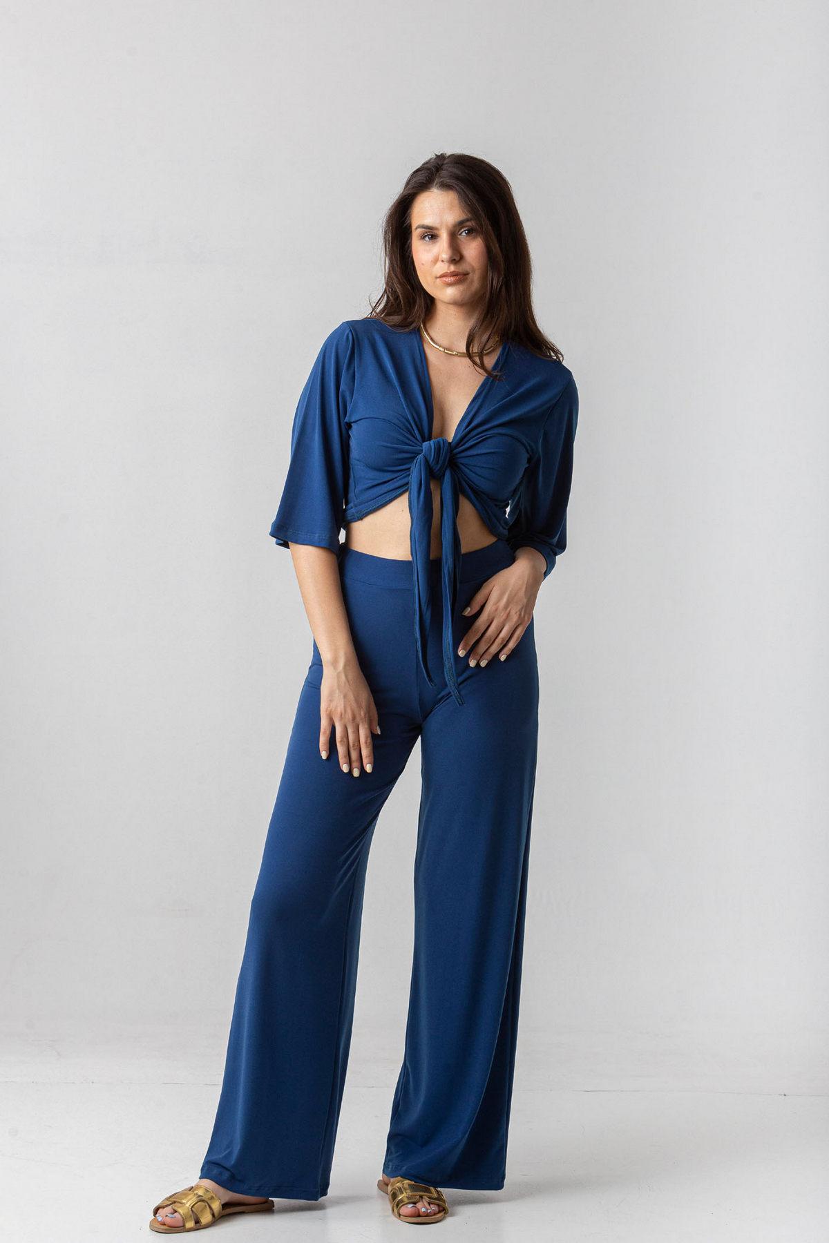 Παντελόνα σε ελαστικό ύφασμα ζέρσεϋ, με λάστιχο στη μέση.