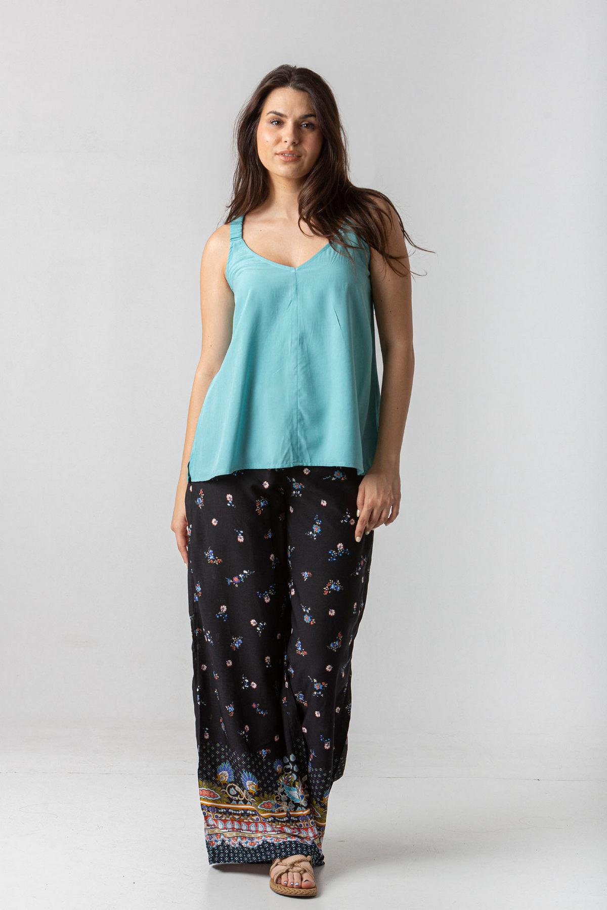Παντελόνα εμπριμέ σε σταθερό ύφασμα με μπορντούρα στο κάτω μέρος.