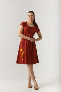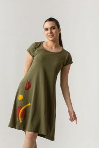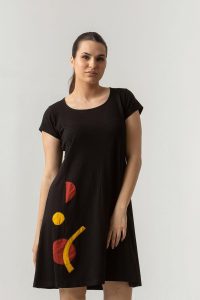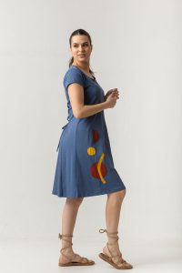 Φόρεμα σε ελαστική βαμβακόλυκρα με applique σχέδιο και κορδόνια που προσαρμόζονται στο πίσω μέρος.