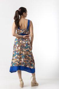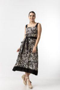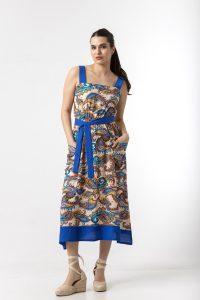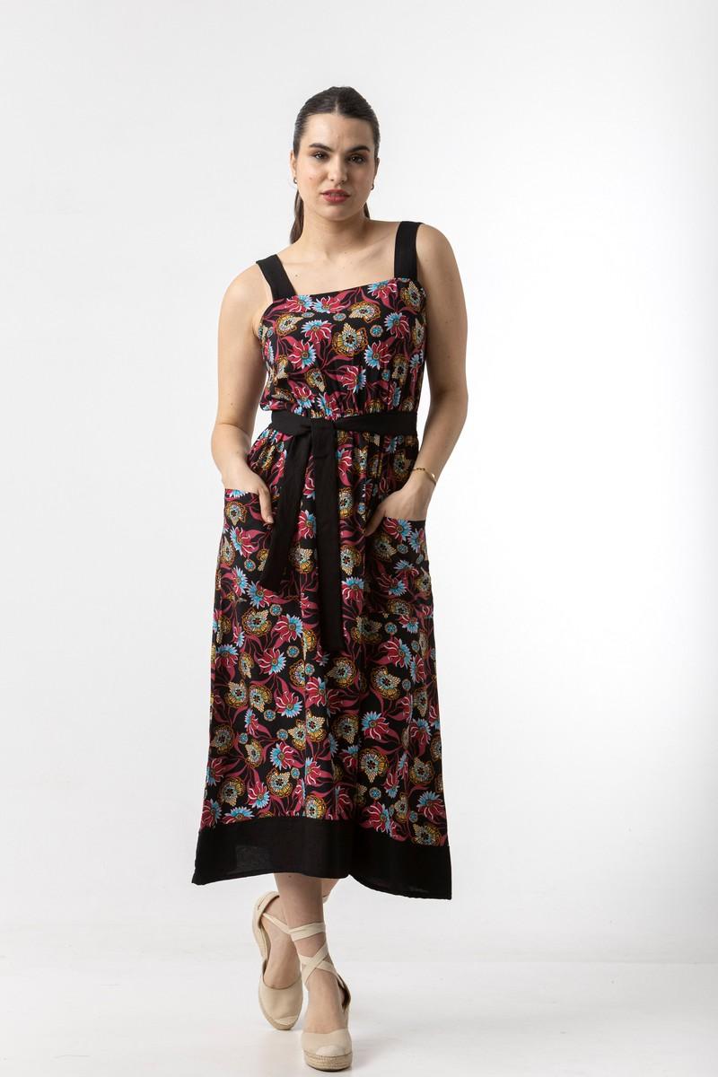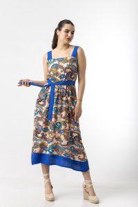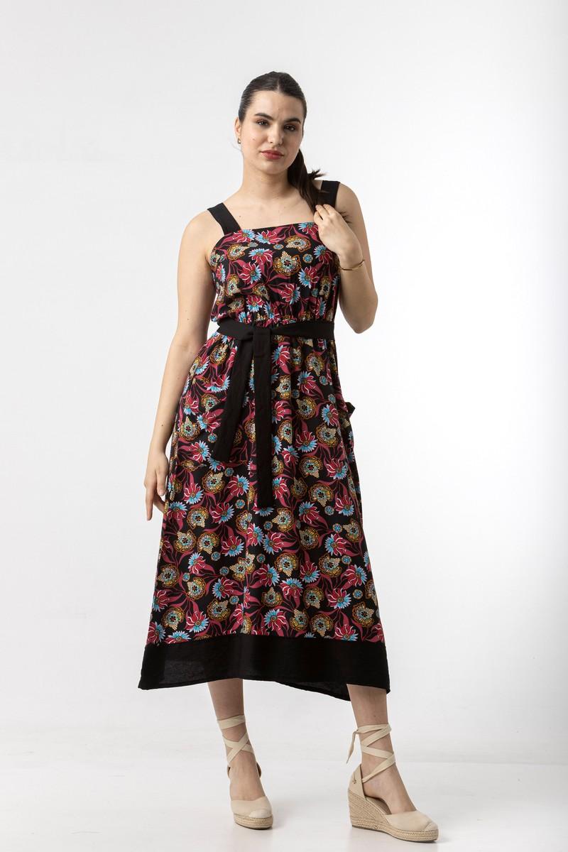 Φόρεμα midi σε σταθερό εμπριμέ ύφασμα, με τιράντες , λάστιχο στη μέση , τσέπες και ζώνη.