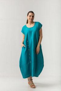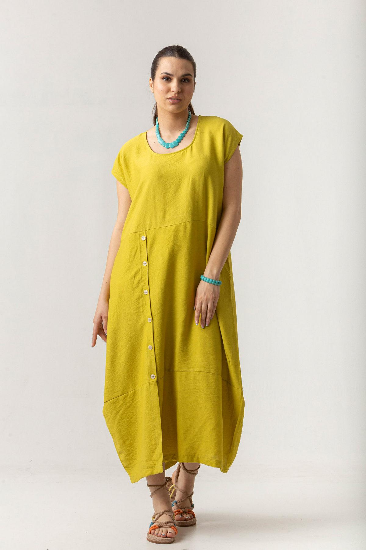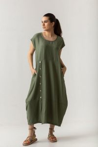 Φόρεμα one-size σε σταθερό ύφασμα με τσέπες και κουμπιά.