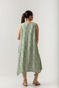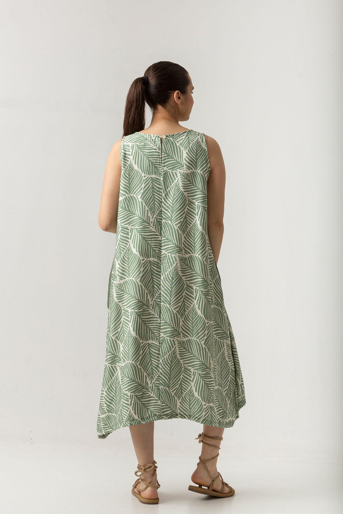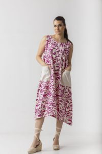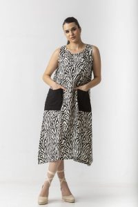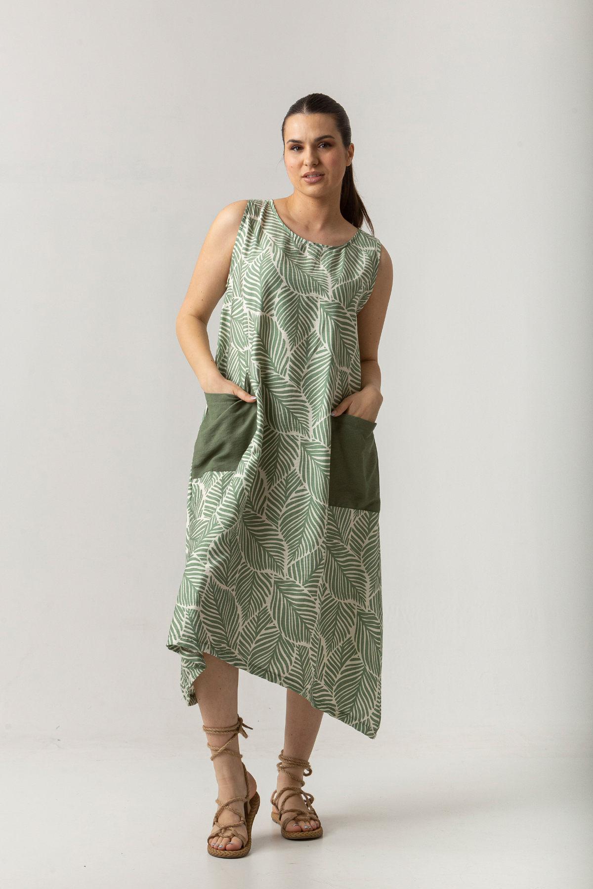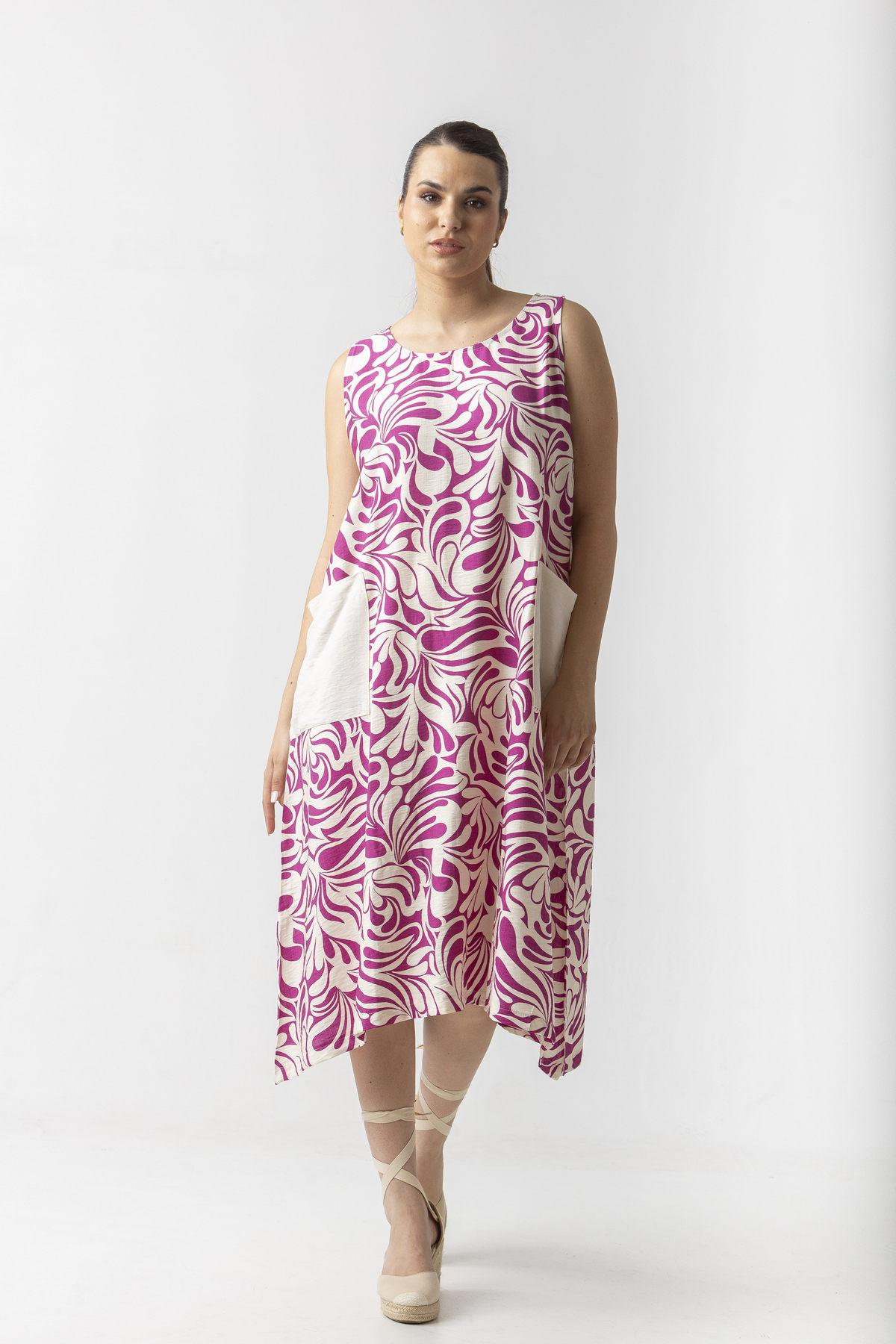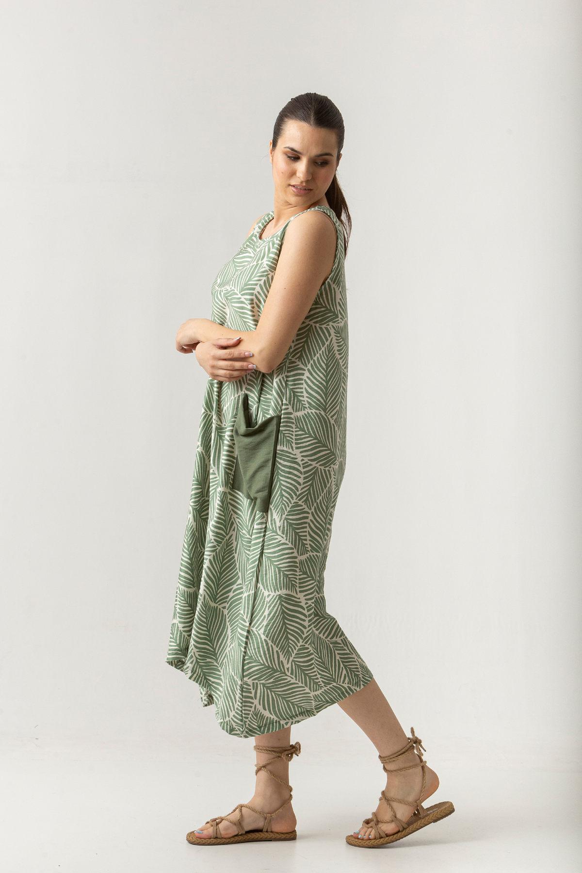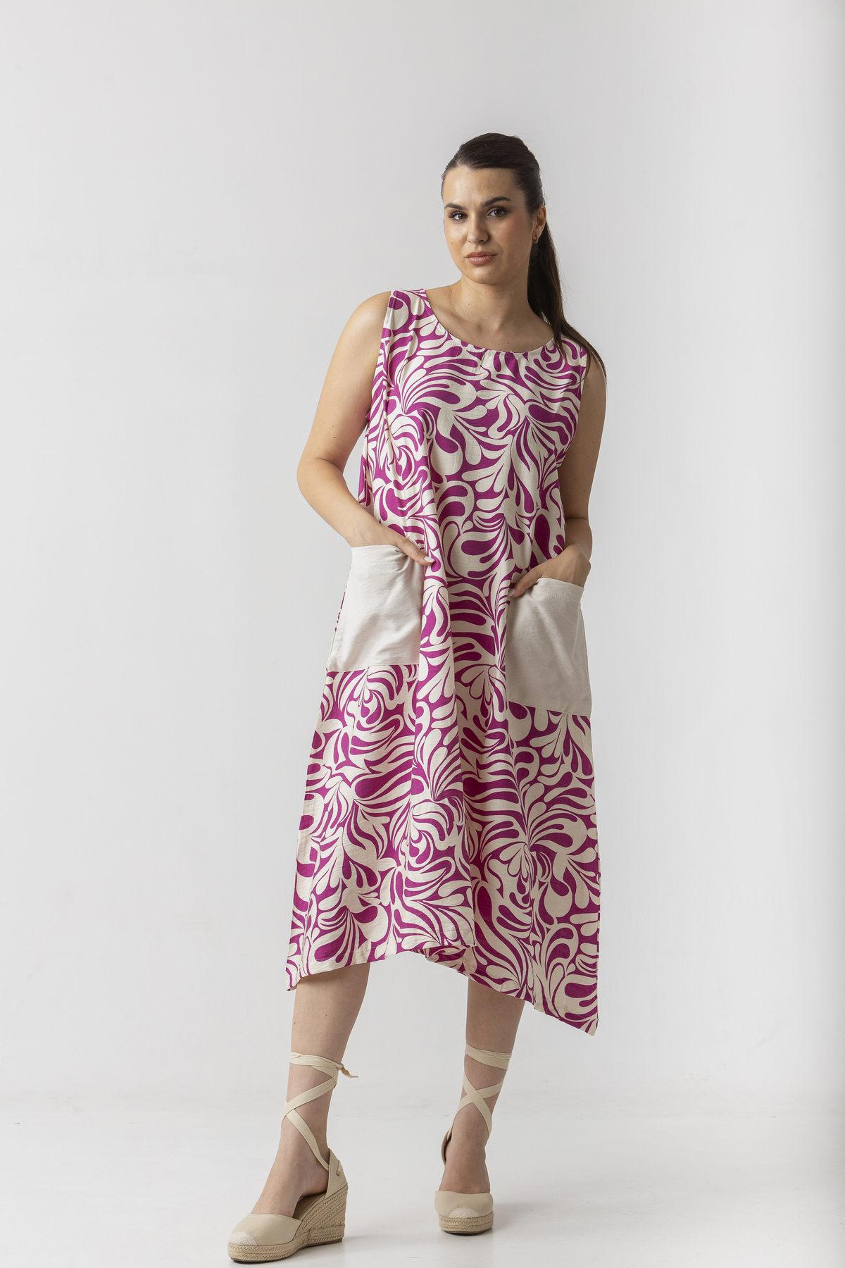 Φόρεμα one-size σε σταθερό εμπριμέ ύφασμα με τσέπες.
