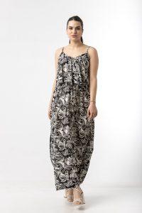 Φόρεμα maxi σε σταθερό εμπριμέ ύφασμα, με τιράντες που προσαρμόζονται και λάστιχο στη μέση και στην πλάτη.